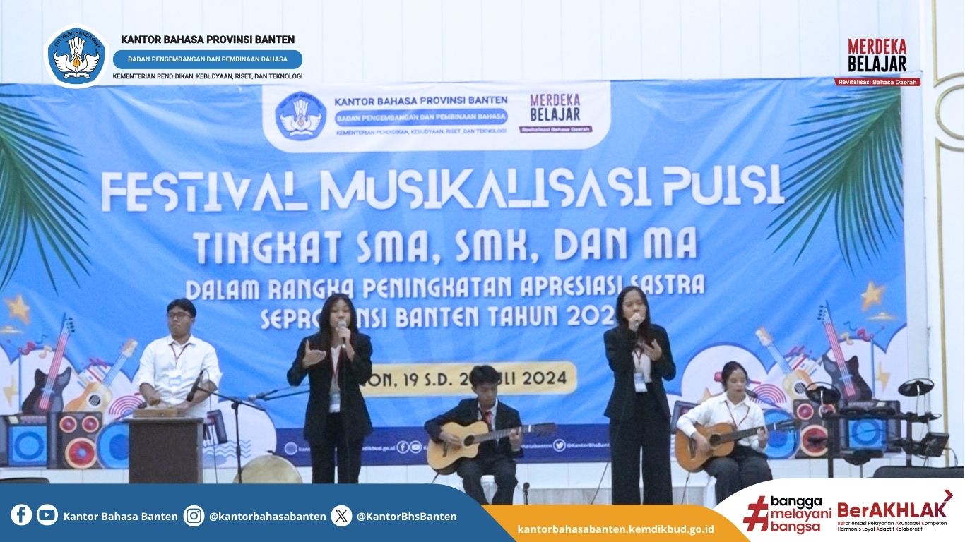 Dalam sambutannya, Kepala Kantor Bahasa Provinsi Banten, Asep Juanda, S.Ag., M.Hum., menyatakan bahwa selain berkompetisi, tujuan festival musikalisasi puisi adalah untuk membimbing generasi muda untuk mengapresiasi teks sastra, terutama puisi. “Melalui medium musik, diharapkan adik-adik bisa memasuki puisi. Karena mengaransemen puisi sebagai komposisi musikalisasi puisi, bisa menjadi tantangan bahkan kesenangan tersendiri,” papar Asep. Bahkan, Asep Juanda pun membacakan puisi Joko Pinurbo yang berjudul Kamus Kecil.