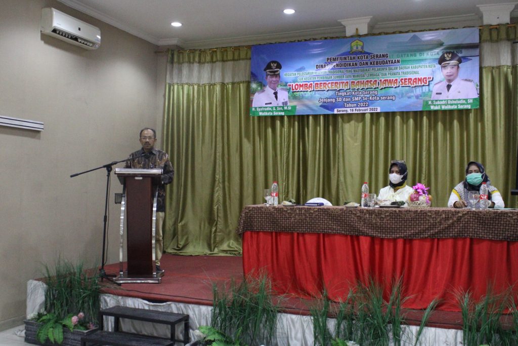 Serang, 16 Februari 2022 – Kepala Kantor Bahasa Provinsi Banten, Halimi Hadibrata, M.Pd. menghadiri kegiatan Pelestarian Kesenian Tradisional yang Masyarakat Pelakunya dalam Daerah Kabupaten/Kota, dengan sub kegiatan Pembinaan Sumber Daya Manusia, Lembaga, dan Penata Tradisional “Lomba Bercerita Bahasa Jawa Serang” tingkat SD dan SMP se-Kota Serang Tahun 2022 yang diselenggarakan oleh Dinas Pendidikan dan Kebudayaan Kota Serang di Hotel Gondang, Serang, Banten.