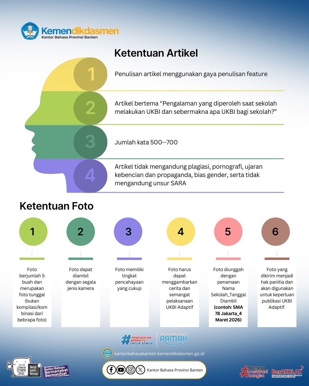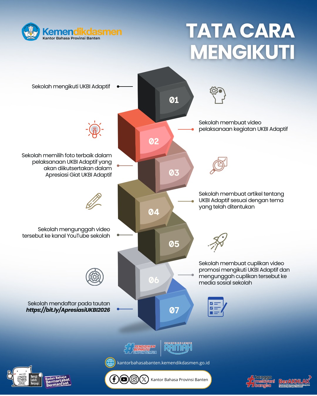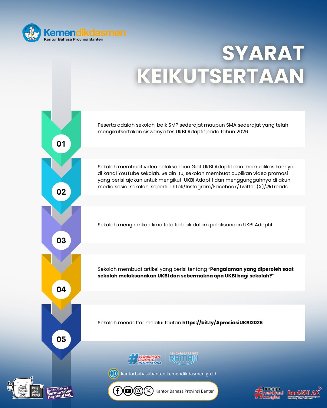 Yuk, Sahabat Bahasa! Saatnya sekolah kalian ambil bagian dalam gerakan literasi bahasa ini. Mari ikut giat UKBI Adaptif dan raih kesempatan memperoleh Apresiasi Giat UKBI Adaptif Tahun 2026. Bersama kita tingkatkan kemahiran berbahasa Indonesia dan wujudkan generasi yang unggul dalam berbahasa!
