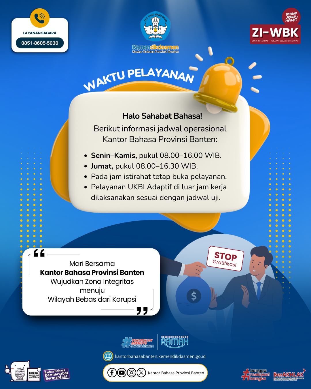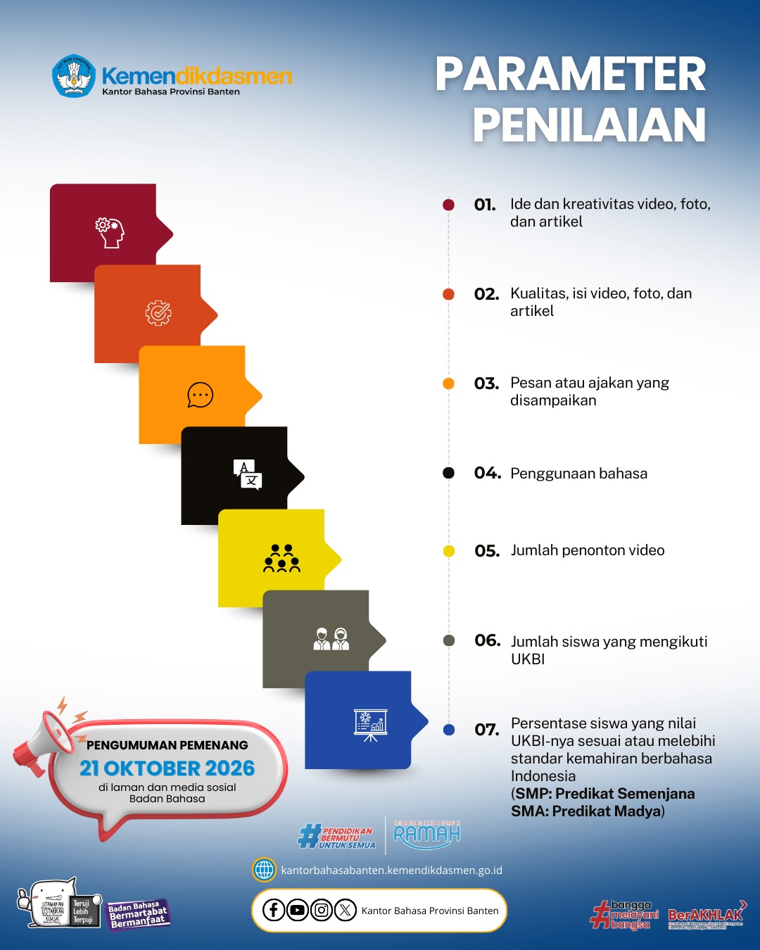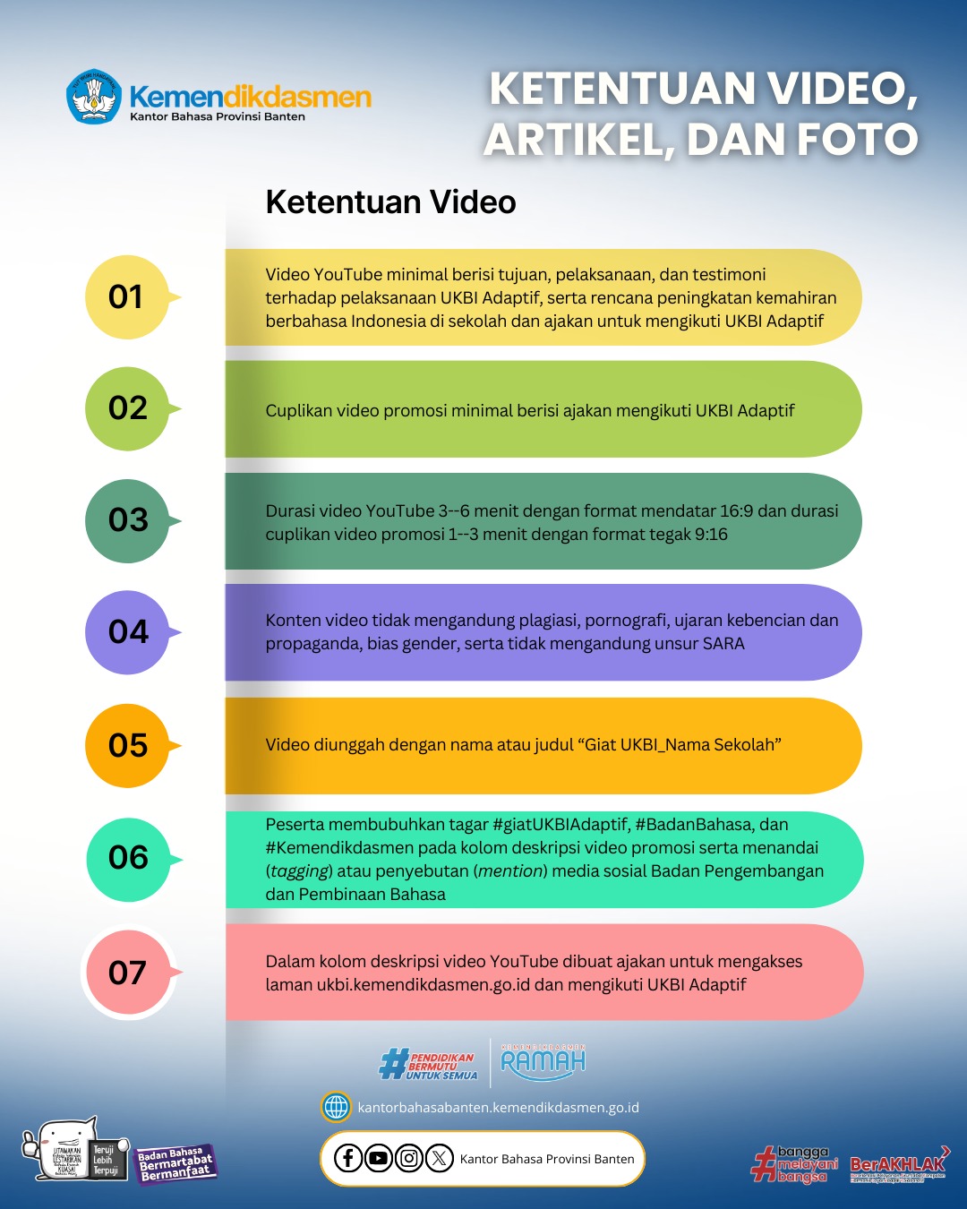Yuk, Sahabat Bahasa! Saatnya sekolah kalian ambil bagian dalam gerakan literasi bahasa ini. Mari ikut giat UKBI Adaptif dan raih kesempatan memperoleh Apresiasi Giat UKBI Adaptif Tahun 2026. Bersama kita tingkatkan kemahiran berbahasa Indonesia dan wujudkan generasi yang unggul dalam berbahasa!