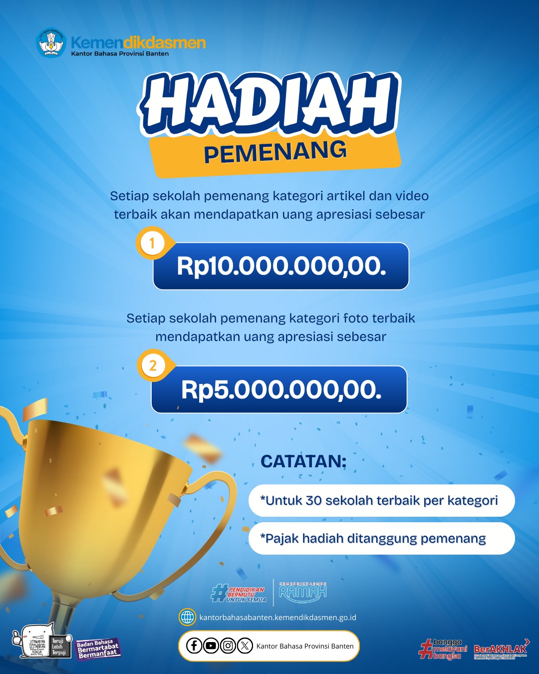 Melalui apresiasi ini, pemerintah memberikan pengakuan kepada sekolah yang telah menunjukkan komitmen dalam meningkatkan kemahiran berbahasa Indonesia bagi siswa, guru, dan tenaga kependidikan. Selain sebagai bentuk penghargaan, program ini juga menjadi upaya strategis untuk mendorong semakin banyak sekolah melaksanakan UKBI Adaptif sebagai sarana pengukuran kemampuan berbahasa Indonesia secara objektif dan terstandar.
