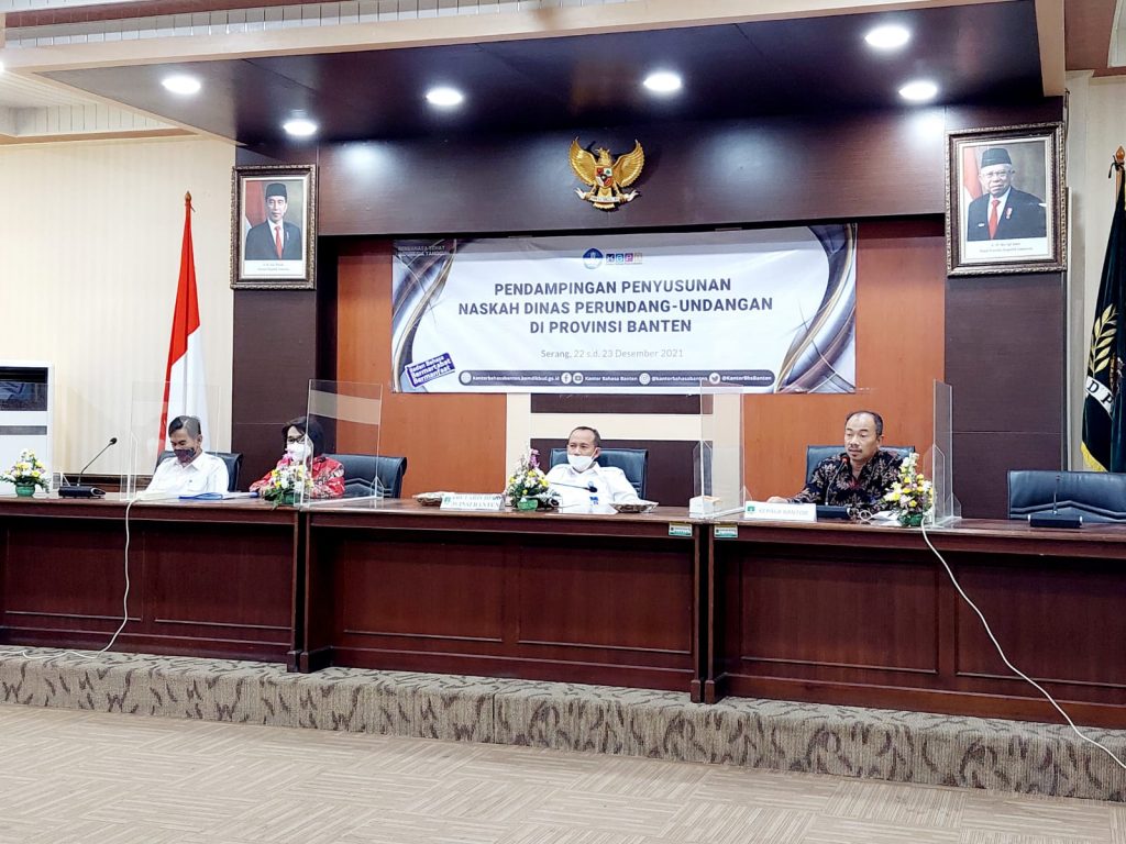 Kantor Bahasa Provinsi Banten menyelenggarakan kegiatan Pendampingan Penyusunan Naskah Dinas Perundang-Undangan di Provinsi Banten. Kegiatan ini dilaksanakan di Gedung Serba Guna Sekretariat DPRD Provinsi Banten, pada tanggal 22 s.d. 23 Desember 2021, mulai pukul 08.00 s.d. 16.00 WIB. Peserta kegiatan adalah tenaga kebahasaan yang memiliki tugas di bidang penyusunan perundangan-undangan di Sekretariat Dewan dan SETDA yang berada di wilayah Provinsi Banten.
