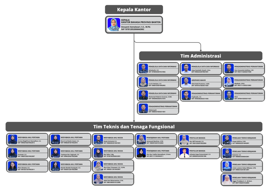 3. Kelompok Jabatan Fungsional.Dalam pelaksanaan tugas dan fungsi Kantor Bahasa Provinsi Banten, Kepala Kantor dibantu oleh satu orang Ketua Tim Administrasi untuk mengoordinasikan pelaksanaan tugas ketatausahaan dan tiga orang Ketua Tim Kerja untuk mengoordinasikan pelaksanaan tugas pembinaan, pengembangan, dan pelindungan.