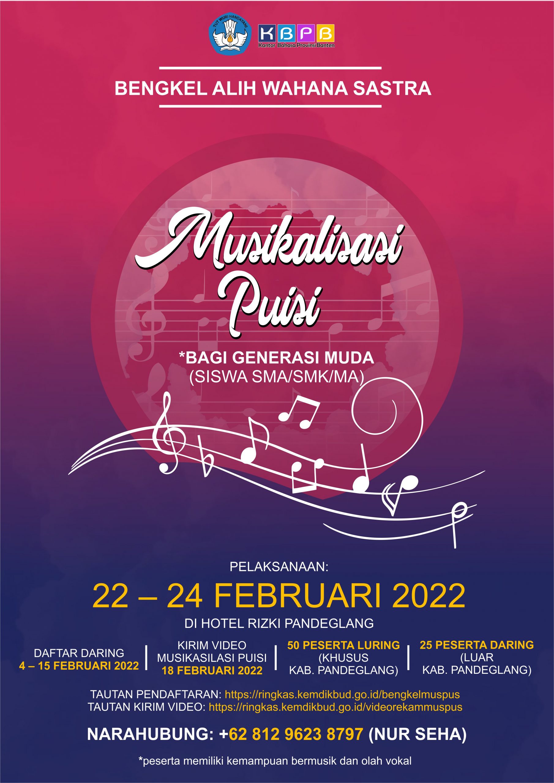 Halo, apa kabar, Sahabat Bahasa dan Sastra? Kantor Bahasa Provinsi Banten akan mengadakan Kegiatan Bengkel Alih Wahana Sastra (Musikalisasi Puisi) bagi Generasi Muda (tingkat SMA/SMK/MA). Bagi Sahabat Bahasa dan Sastra yang suka pada Musikalisasi Puisi, yuk ikuti kegiatan ini! Sahabat Bahasa dan Sastra dapat mendaftarkan diri melalui tautan yang ada di poster diatas atau ketuk pada tautan berikut.