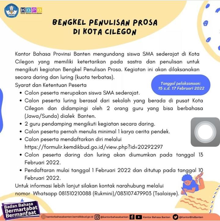 Halo, apa kabar, Sahabat Bahasa? Kantor Bahasa Provinsi Banten akan mengadakan Kegiatan Bengkel Penulisan Prosa di Kota Cilegon. Bagi Sahabat Bahasa yang suka menulis prosa, yuk ikuti kegiatan ini! Sahabat Bahasa dapat mendaftarkan diri melalui tautan berikut.